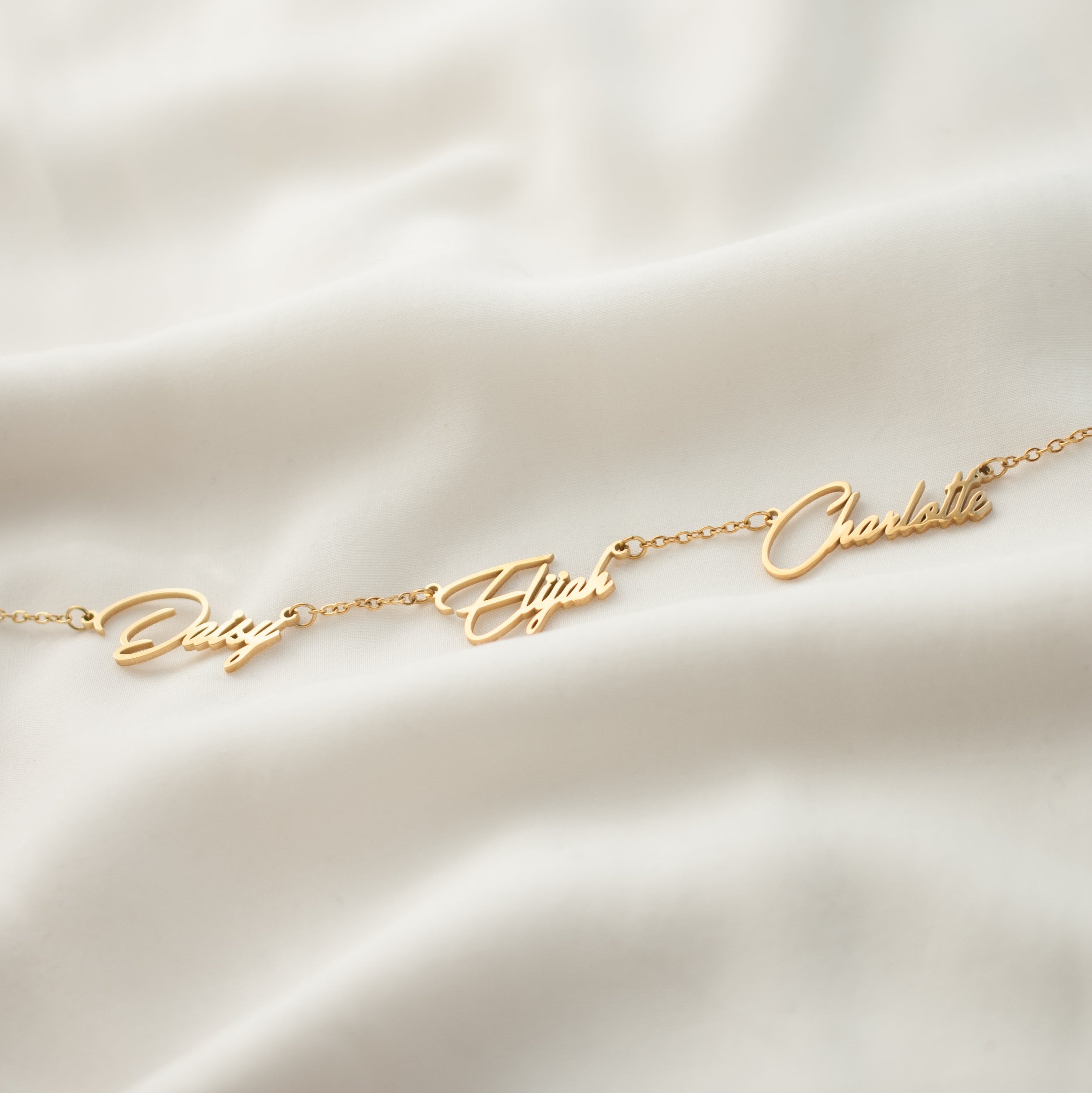 Celebrate your loved ones with our Multiple Name Necklace. This personalized piece allows you to customize up to four names in a sleek, modern design. Available in silver, gold, and rose gold, it’s the perfect way to carry the people who matter most close to your heart. Elegant, meaningful, and perfect for layering or wearing solo
